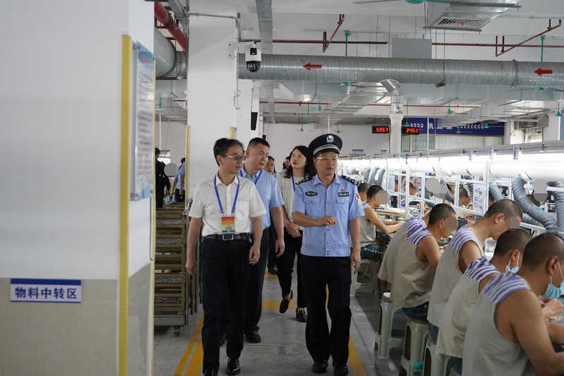 高明監(jiān)獄政委唐典全、副監(jiān)獄長劉勇陪同參觀。文圖/張麗紅 高明監(jiān)獄